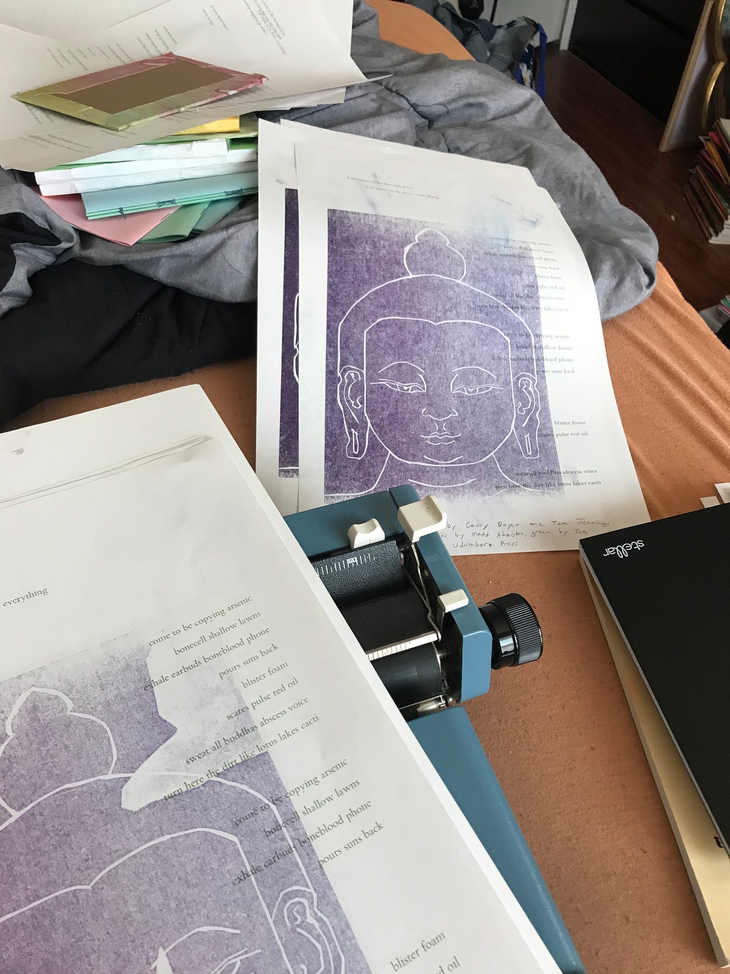 After the show I gave away almost all my letterpress prints. I expected people to like my lino-carved Buddha-head, with Matt’s Hover lyrics and a poem of mine juxtaposed around it. But everyone went for the pressure-printed cut-out (from a postcard) of the Sri Lankan Kurunegala Tara bodies clouding over the page, some in uneven blue, some a purple blend… her seated posture over and over again…